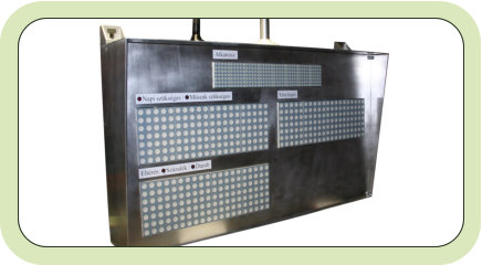 A kijelző mérete 700 x 400mm. A felső karaktersor 53mm magas, az alsó 100mm.